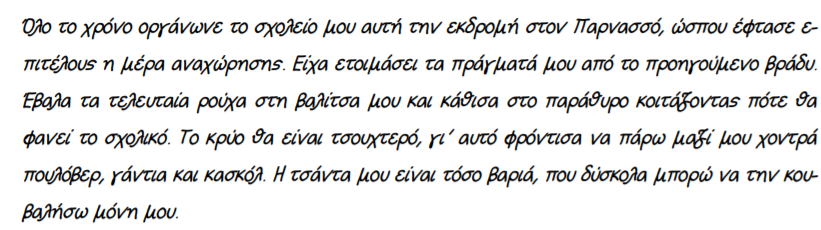 Φέτος είμαι δώδεκα ετών και πηγαίνω στην έκτη τάξη του δημοτικού. Ο δάσκαλος με τοποθέτησε στο τρίτο θρανίο, γιατί, όπως λέει, είμαι ψηλός και θα κρύβω τα άλλα παιδιά. Λόγω συνένωσης δύο σχολείων η τάξη μας μεγάλωσε αρκετά. Από δεκαοχτώ μαθητές που είχε πέρυσι, φέτος έχει τριάντα. Σχεδόν τους διπλάσιους. Για τον λόγο αυτό τη χωρίσανε σε δύο τμήματα. Ευτυχώς η παρέα μου δε χωρίστηκε και θα είμαστε στο ίδιο τμήμα. Ήρθαν και καινούριοι δάσκαλοι μα εμείς θα έχουμε τον ίδιο, που είναι πολύ συμπαθητικός. Έτσι για μας η χαρά είναι διπλή. Τα βιβλία που μας έδωσαν είναι καμιά δεκαπενταριά. Μας είπαν να πάρουμε και από μια οχτάδα τετράδια ο καθένας. Ο διευθυντής μας, την πρώτη μέρα, που ήμαστε συγκεντρωμένοι σε τριάδες στο προαύλιο του σχολείου, μας τόνισε ότι η προσπάθειά μας φέτος πρέπει να είναι τριπλάσια από πέρυσι. Εμείς κοιταχτήκαμε κάπως, κι ευχηθήκαμε να περάσει γρήγορα και χωρίς πολλές εκπλήξεις κι αυτή η χρονιά!
